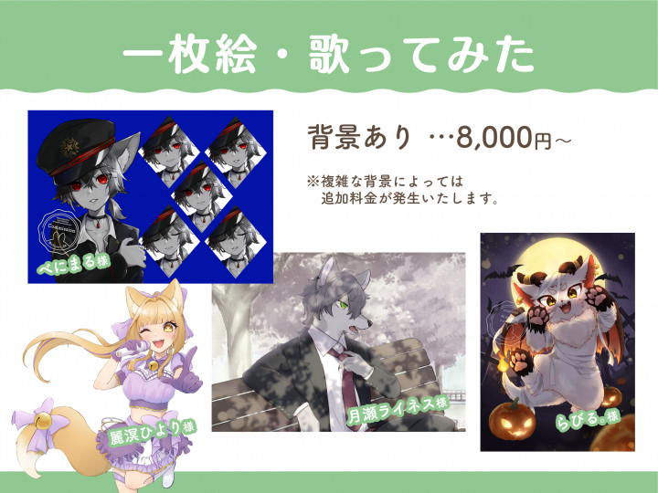 一枚絵や歌ってみた、アイコン等も!動物や獣人もOKです!