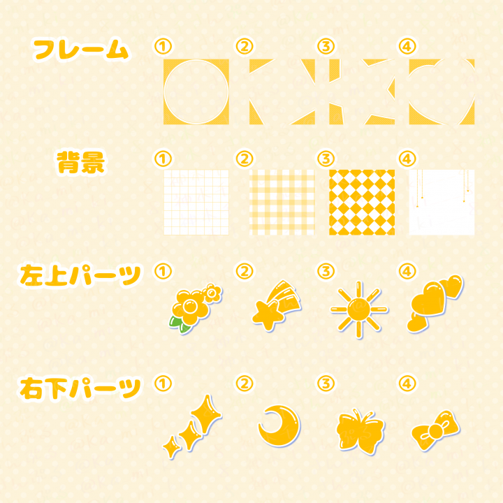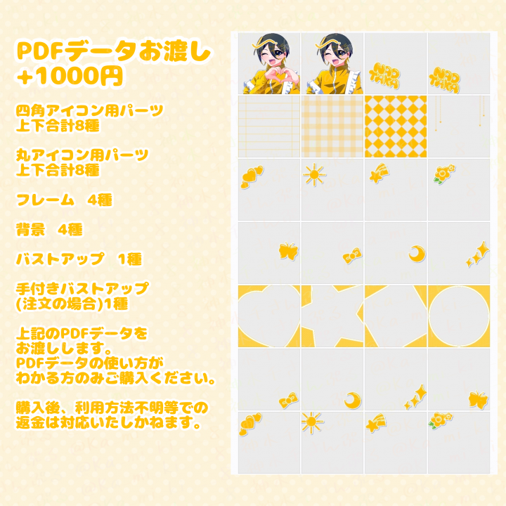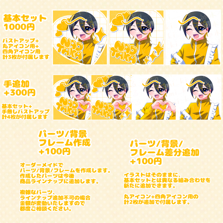 バストアップ+選べるパーツフレーム背景セットでお手軽にアイコンを作成します。 |