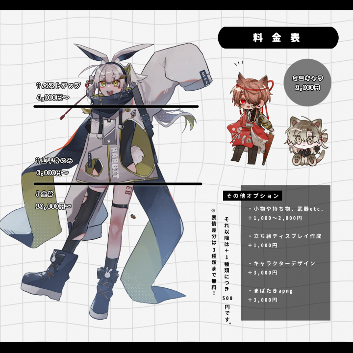 TRPG、ゲーム、動画などに使用する立ち絵の作成をします。 |
