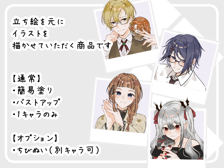 ・普段10代〜30代前後の男女を中心に制作しており、描き慣れていない40代以降のお年寄りや細マッチョ以上の筋肉をもつキャラクター、ケモ系以上の動物、メカ系はご希望に添えない場合があります。 |