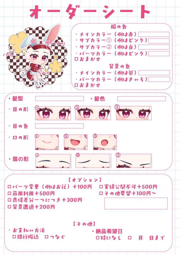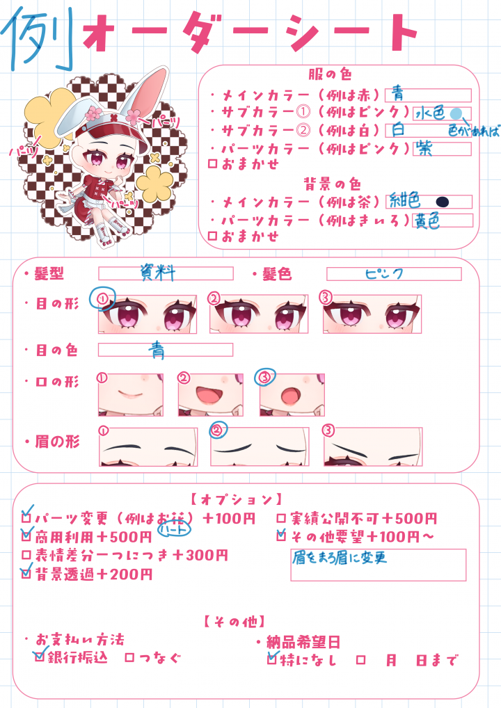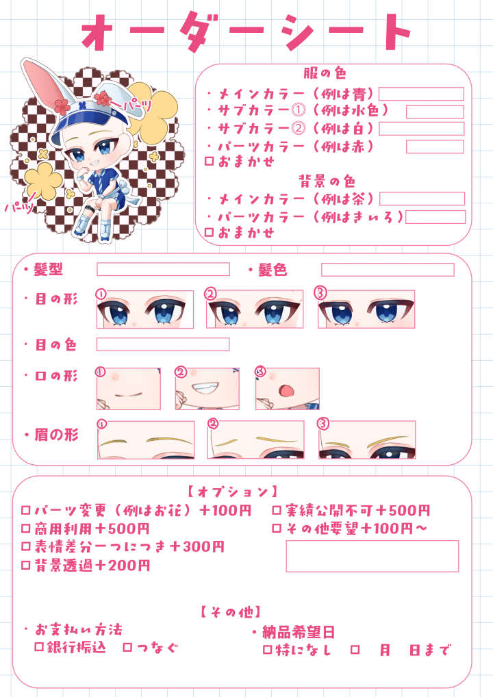 ・完成した作品はサンプルとしてSNS等で使用させて頂く場合がございます。(使用不可の場合は予めご連絡お願い致します。) |