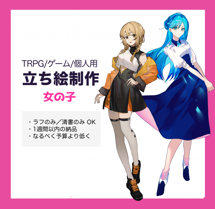 ▼SNS用のアイコン、キャラクターデザインやゲームイラスト、TRPG用立ち絵、IRIAM(イリアム)等のVtuber用イラストなど様々なニーズに対応できるイラストレーターや絵師が数多く登録しています。またLive2Dのモデリングなど高い技術が必要な依頼・販売にもおすすめです。イラスト関連の仕事の受発注を始めるなら、他社外注サイトより手数料が低く、依頼料金の相場を下げられるつなぐで!