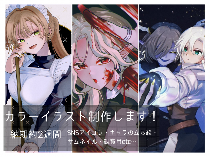 創作キャラクターの立ち絵、シチュエーションイラスト等、クライアント様のご要望に寄り添って行ければと思いますので、是非お気軽にお問い合わせ下さい!