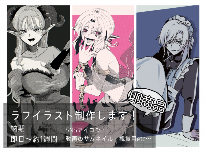 ・ご依頼頂いたイラストをポートフォリオにて公開する可能性がございます。非公開でのご依頼をご希望の場合はお問い合わせの際にお申し付け下さい。
