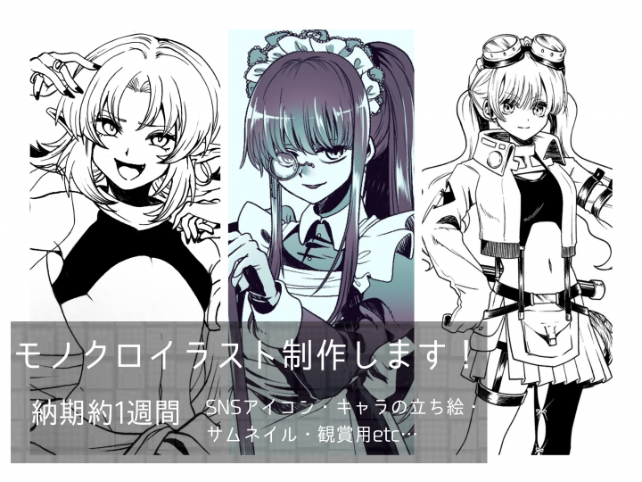 カラーイラスト同様バストアップ、立ち絵、背景込み、追加オプション等で料金の変動がございます。