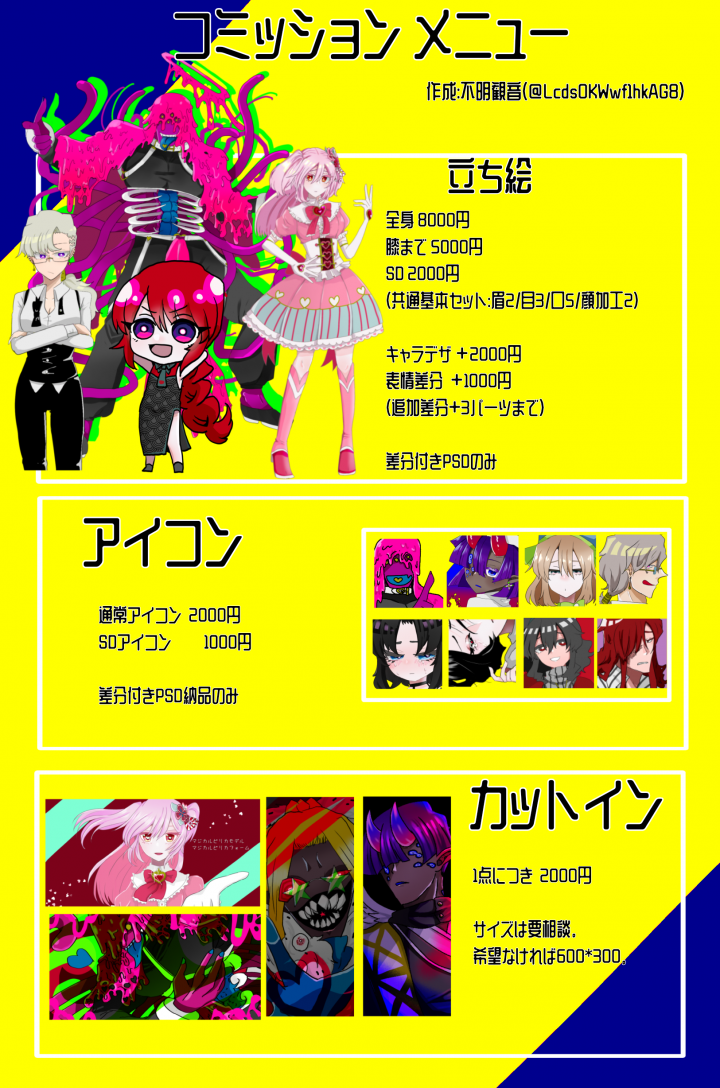 キャラ販売を中心にしています。 筋肉か人外か女しか出さないかもしれません。 よしなに。 依頼内容になります。 納品は全てPSDとなります。 立ち絵 全身 8000円 膝まで 50