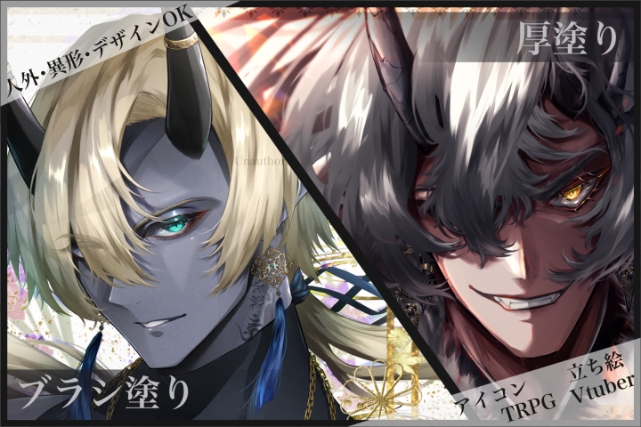 ご覧いただきありがとうございます。 SNSアイコン・立ち絵・キャラクターデザイン・創作イメージイラストなど、オリジナル作品を中心に制作中です。 【実績】17件(海外コミッション含む) 主