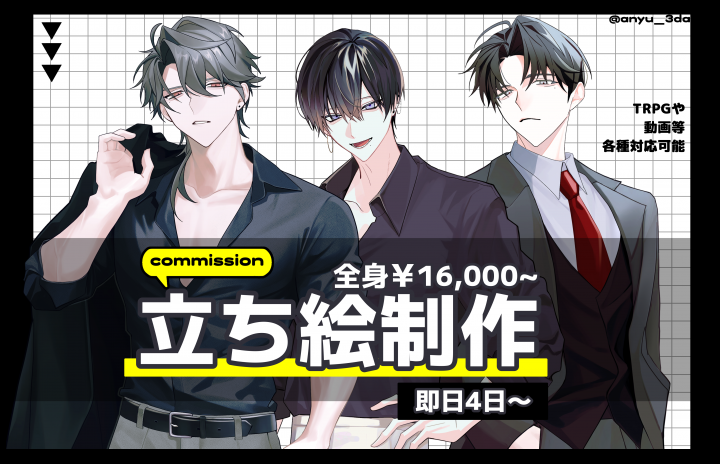 閲覧いただきありがとうございます! □10〜30代の男性を描くのが得意です。 ↓主に承っているもの ⟡TRPG、動画用立ち絵 ⟡SD立ち絵 ⟡SNSアイコン ⟡Live2D用イラス