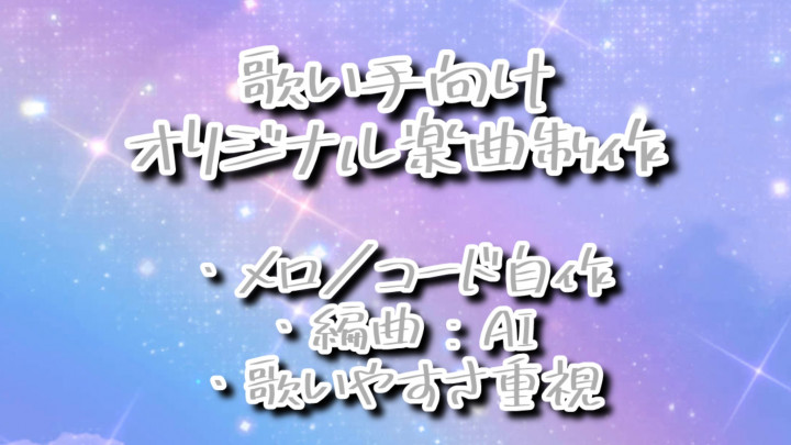 オリジナル楽曲の制作を行っています。 メロディ・コード進行・構成は自身で作曲し、 編曲工程の一部にAIツールを補助的に使用しています。 歌モノ楽曲や、歌いやすさを重視したカラオケ向け音源