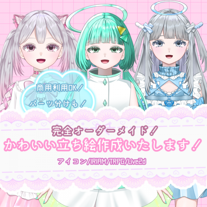 IRIAM対応立ち絵を販売しております。IRIAM対応商品は全て動作確認済みですのでご安心ください。IRIAMデビューをお考えの方やTRPGイラストをお求めの方はぜひお任せ下さい!SDキャライラストや、ネームロゴの作成もできますので、お披露目準備も万端にできます!かわいい女の子やふわふわかわいいネームロゴを作成する事が好きです♡