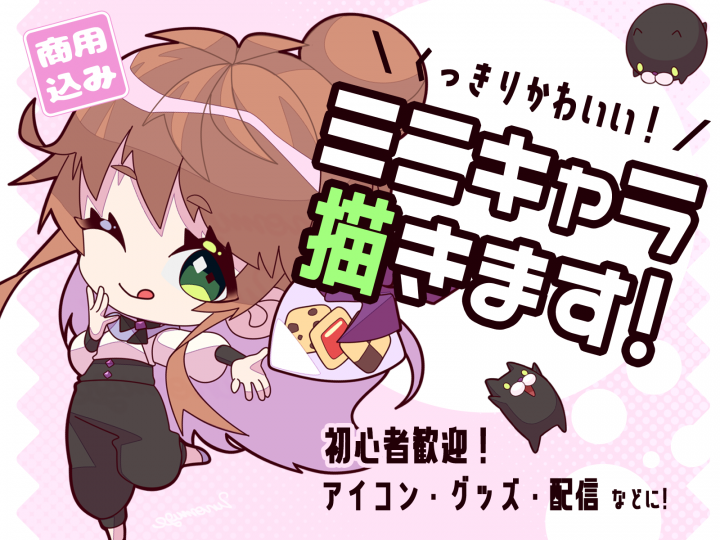 線画が太め・アニメ塗りベース・立ち絵・ミニキャラが得意です!