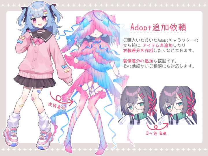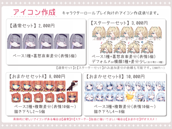 主にキャラ販売のみの活動予定です。 ご購入いただいたキャラ関連のご依頼のみ、稼働状況に関わらずご相談いつでも歓迎しております。 こちらの都合でお断りする可能性もございますが、まずは一度お気軽に