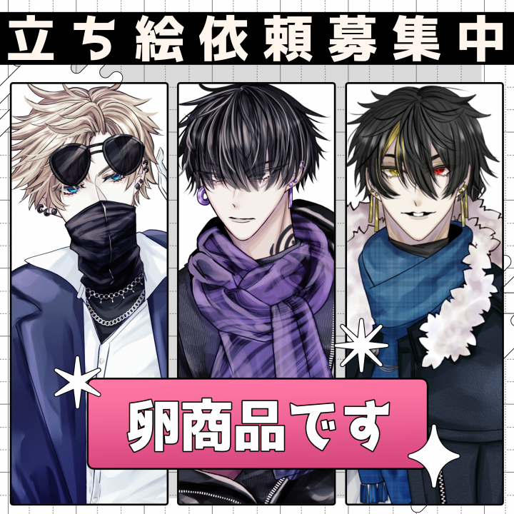 髆(はく)と申します。 ▶ご依頼可能 キャラクター販売、立ち絵作成 ▶内容次第 / 要相談 ディスプレイ作成、トレーラー製作 内容次第ですが納期は1週間~2か月で見積もっています。ご