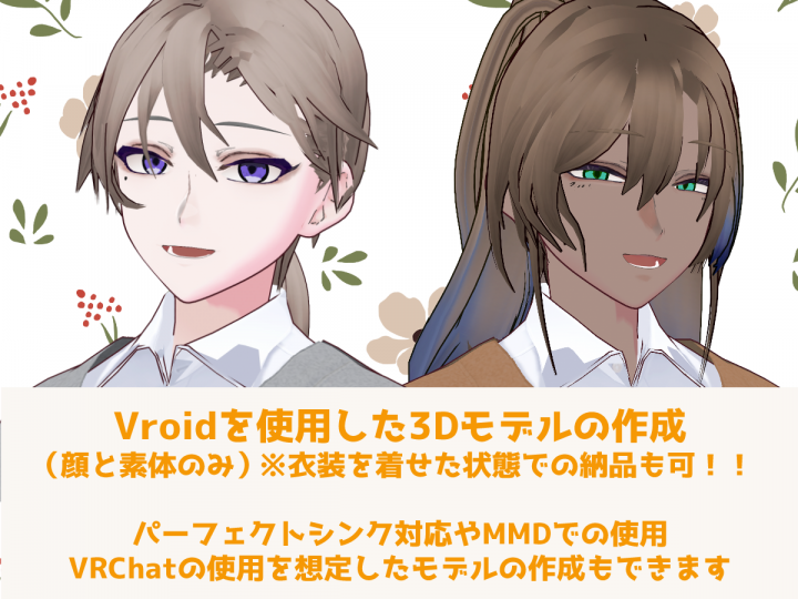 Vroidの顔周囲のみのモデリングを可能です。(肌・衣装などは双方所持かつ代理で着せるのが禁止されていなければ無料で着せて納品します)