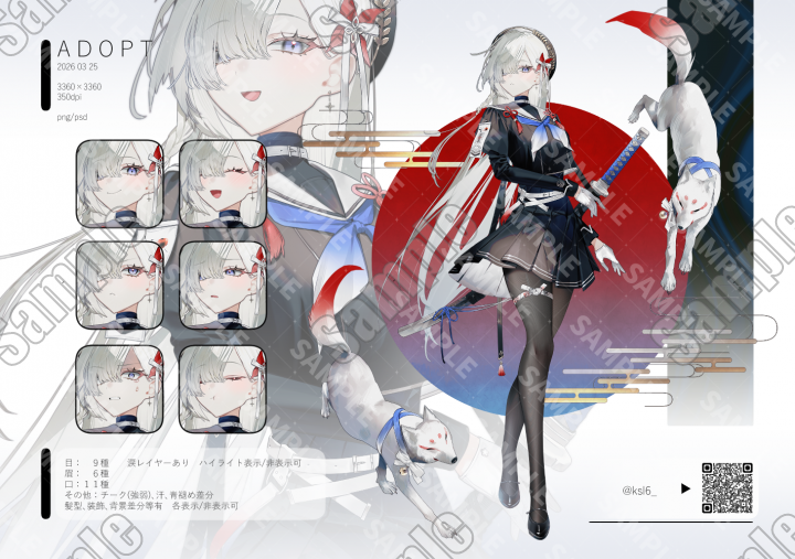 特にご指定が無い場合、普段出品しているadoptと同様のデータサイズ、表情差分のpsd納品となります。