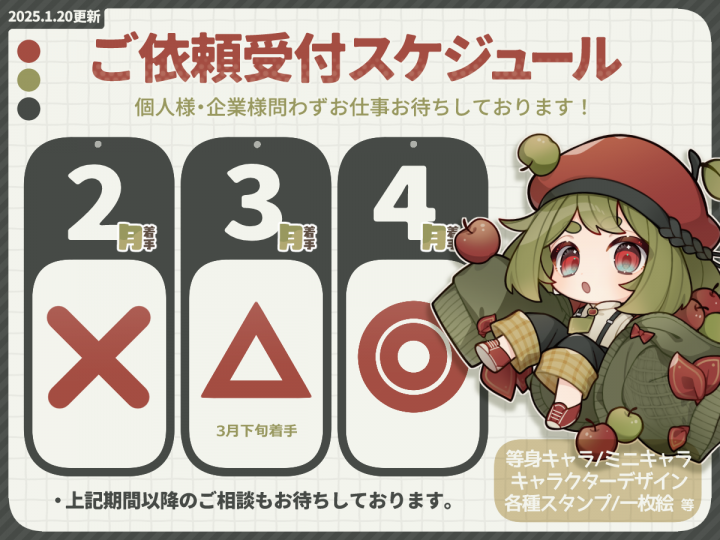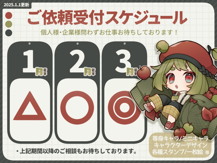 【受付状況:1月△/2月○/3月◎/4月以降◎ 】 閲覧ありがとうございます。 10~20代くらいのキャラクターが得意です。 精一杯頑張りますので、よろしくお願いします! ■主な制