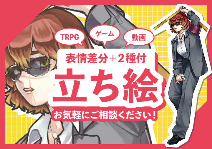 TRPGやゲーム用の立ち絵/SDイラストを作成します。後々、イラスト制作やトレーラーデザイン、漫画作成などもお受けできたらいいな〜と思っています。