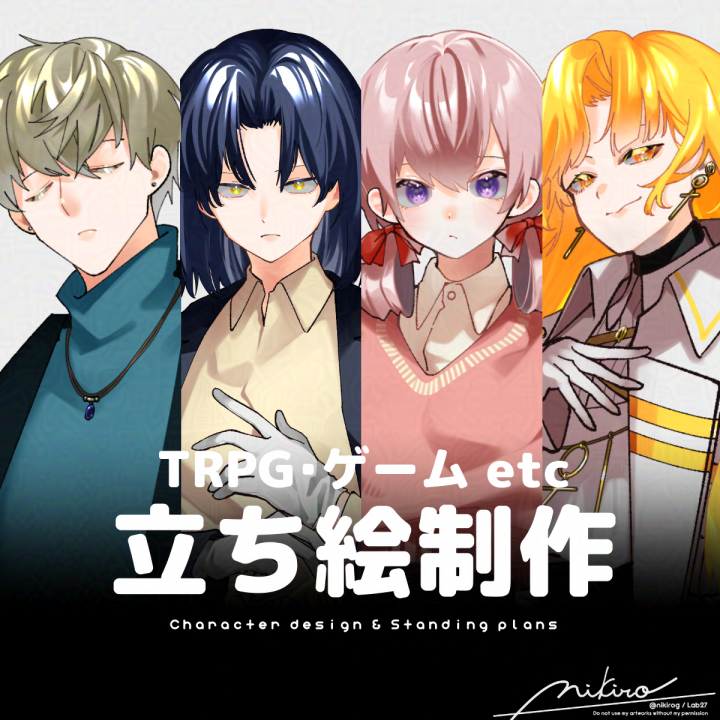 普段はTRPGを中心にゲームやSNS、配信で使えるキャラクター立ち絵制作のイラスト依頼を受け付けています。