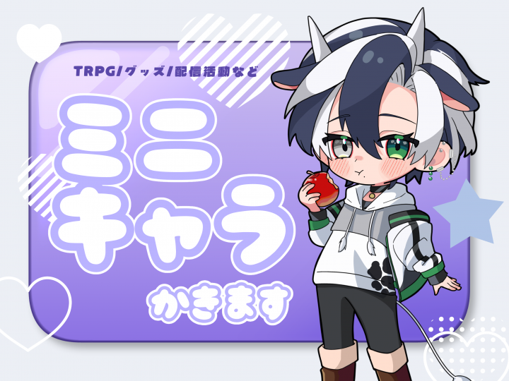 ポップでかわいい絵柄のもの、ミニキャラが得意です! TRPG、動画、配信、ゲーム他、様々な用途に使用できるキャラクターイラストを作成いたします。 お見積りだけでも大丈夫です、お気軽にご相談ください