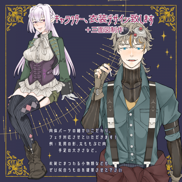 ファンタジー/ゴシックを軸に活動するイラスト制作しています。 スチームパンクや人外融合デザイン(ケモ耳・機械装飾・球体関節モチーフ)など、 物語性のあるキャラクター制作を得意としています。