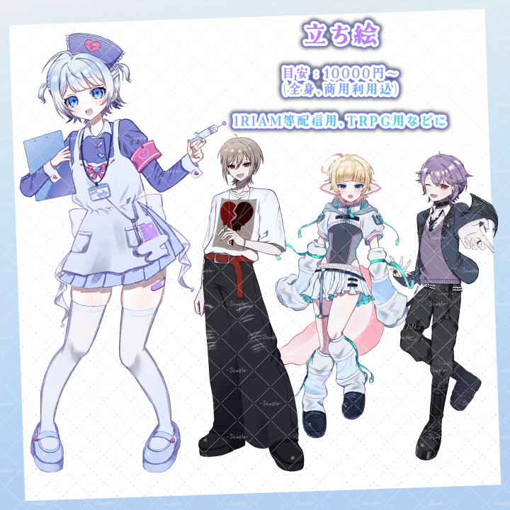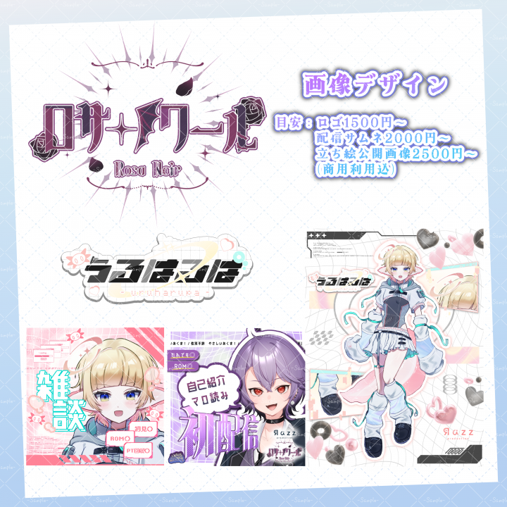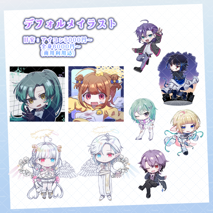 立ち絵、デフォルメ、一枚絵、ロゴやサムネイルまで何でもお気軽にご相談ください!